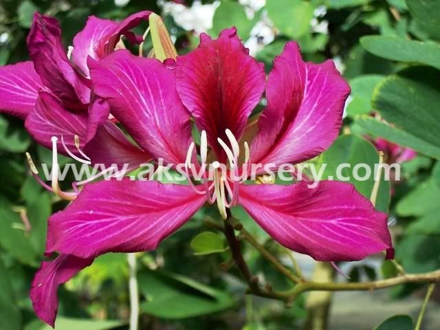 The most beautiful orchid tree. The tree was originally described as a new species in 1908 after being discovered on the near Hong Kong around 1880 and was named after a Hong Kong governor Sir Henry Blake who had a strong interest in botany. The tree is of medium size with alternate large heart shaped leaves. Large deep-purple flowers appears from January to May. The beautiful display of slightly fragrant orchid-like blooms makes the tree so desirable for the landscape. The flowers attract butterflies and bees. The species is believed to be sterile and will not set seed so the plant will not drop long pods as other orchid trees do. The flower of Bauhinia blakeana was adopted as the emblem of Hong Kong in 1965.