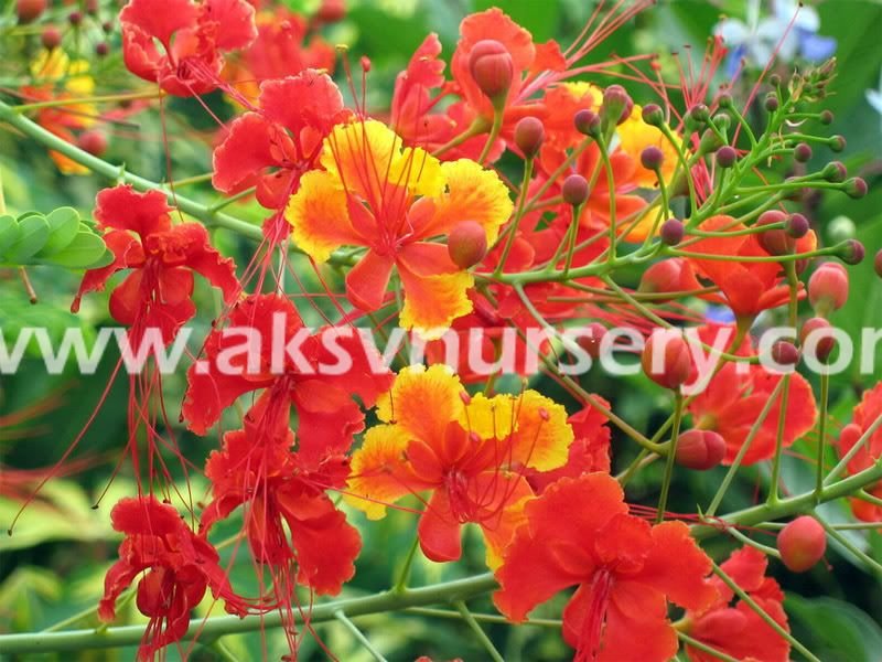 This variety of caesalpinia has very bright flowers turning from yellow to red – with yellow, orange and red flowers in the same bunch. The stem is covered with soft thorns that feel like feather. Medium size shrub or samll tree, perfect for small yards or patio. It is moderately tolerant of salty conditions. Peacock flower benefits from pruning, and can be shaped to tree form or shrubby bush form. The striking orange red flowers are an attention grabber! Use peacock flower as a specimen or in a mixed shrub border. It has an open, spreading habit and the branches sometimes get too long for their own good and break off. Still, a line of peacock flowers makes a showy fine-textured screen or informal hedge. You can cut peacock flowers to the ground in late winter or early spring to get a bushier, more compact shrub.